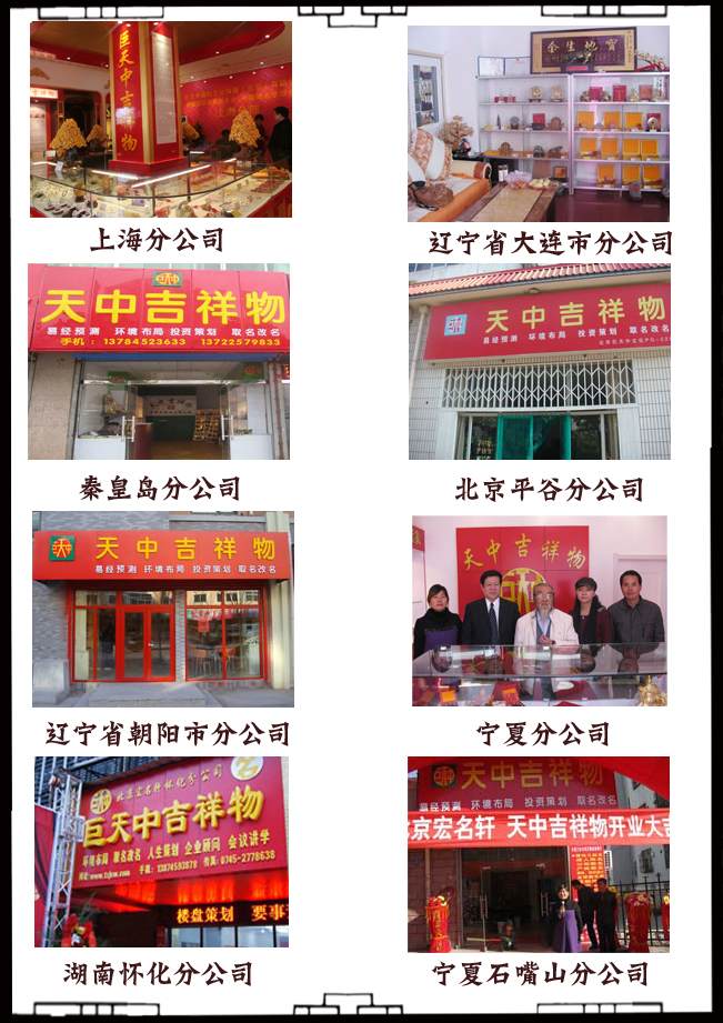 [四、区域代理投资说明] 代理费用:按区域划分(参考上文) 代理期限:一次性交费,代理权免费使用3年,违约情形除外。 扶持条款 1、公司宣传展板(老师、专家简介)(公司活动)(公司业绩) 2、巨天中会长所有专著 3、授权铜牌 4、授权书 5、加盟店装修效果图 6、最新业务咨询表格 7、免费协助选择店址 8、店名免费判断,免费起店名 9、工作流程免费培训 10、专业课程半价学习 备注:合同细节来电咨询 [五、开店选址] 根据经验,以下地方开店较佳 1、商场、超市、购物中心及其周围; 2、商业街上; 3、旅游景点区域; 4、时尚店铺集散地区; [六、销售指南] 1、开业前集中宣传,强势入驻本地区。 2、开业时,请当地有影响的人物剪彩,为了烘托气氛,可邀请乐队,长时间的演奏。最好请当地的媒体参加,要及时的拍照、摄影、留下有意义的东西。 3、开业前三天准备一些礼物赠送先到者。 4、开业后进行持续的宣传活动,每2个月至少一次。 5、印发精美的册子、宣传单;要弄得满城皆知。 6、在重大的节日,如春节,中秋节,清明节,父亲节,母亲节,端午节,情人节,元宵节等推出有文化力度的组合方案。 7、狠抓节日、假日促销。像元旦,春节等重大传统节日来临前,一定要备足货源,根据各连锁店经验,这些节日的销量可能是平常的几倍,往往一天的销量相当平时的一个月;要是组织的好,仅一个节日说不定就完成全年业绩的一半,所以一定要利用好节日,提前营造好店内外节日氛围,打有准备之仗。 [七、总部支持] 1、全套营运支持:提供详细的专卖店营运手册,指导加盟店形成一套简单、有效、规范的运作体系。 2、强力培训支持:公司总部将对加盟店进行系统的专业知识培训,以提高加盟店店员素质。 3、厂价供货支持:超低厂价供货价格,超大利润空间,确保加盟商利益最大化。 4、开业赠品支持:统一宣传资料、招贴画等。 5、退换货支持:完善的退换货制度,让您后顾无优。 6、人力资源支持:总部资深专家全力协助支持。 7、选址评估支持:总部资深风水专家协助选址,让您吉星高照,好风好水好运来!