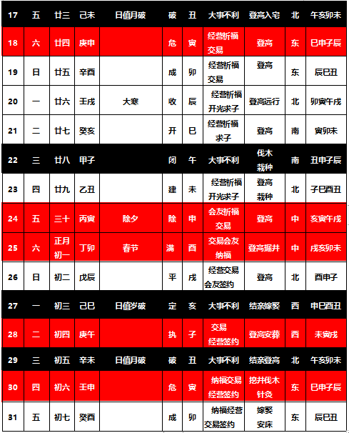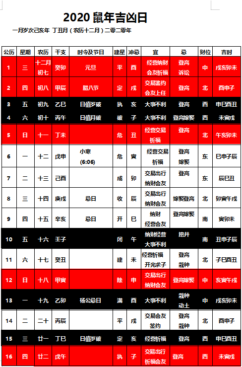 2020年 一月老黄历 吉凶择日