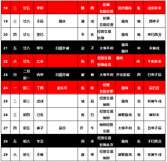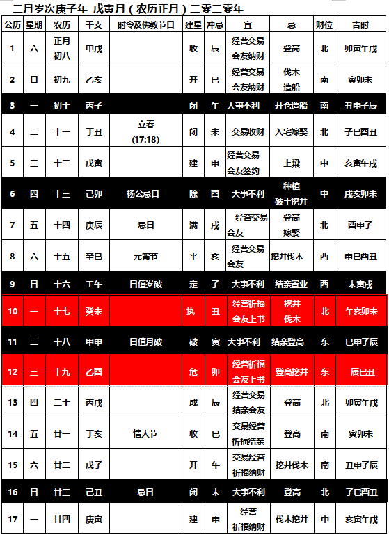 大易开运周易专家团:2020年2月吉祥日历 ![]() ![]() 择吉名言 《天元造命歌》曰:“不得真龙得日月,也应富贵旺人家。”“初时祸福天时应,日久方知地有权。” 古书云:“三分选地,七分择日”。 二月岁次庚子年 戊寅月(农历正月)二零二零年